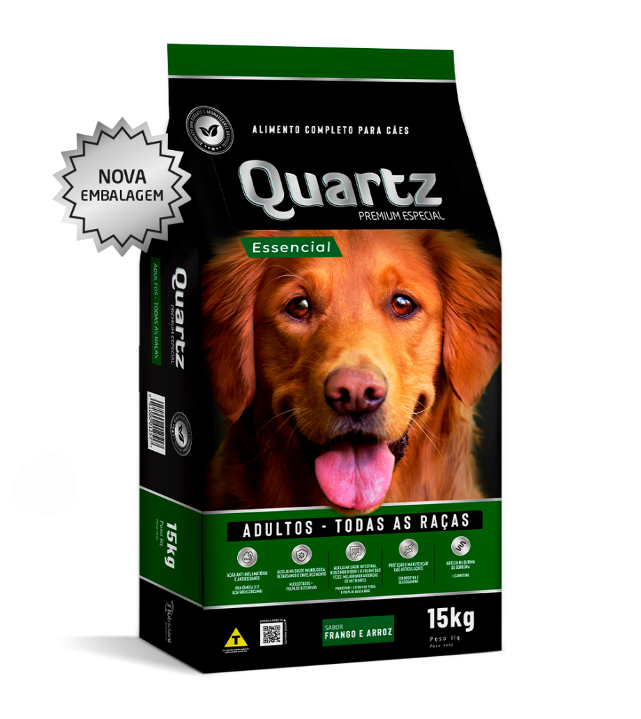 Quartz Adultos Essencial é um alimento premium especial com 22 % de proteínas. Sua fórmula é elaborada com matérias-primas selecionadas e de ótima qualidade. Possui em sua formulação DHA (Ômega 3), Nucleotídeos + Polpa de Beterraba, Prebiótico , Extrato de Yucca e Ômega 6, tudo para garantir um produto que atenda às necessidades do animal mantendo a saúde perfeita.
